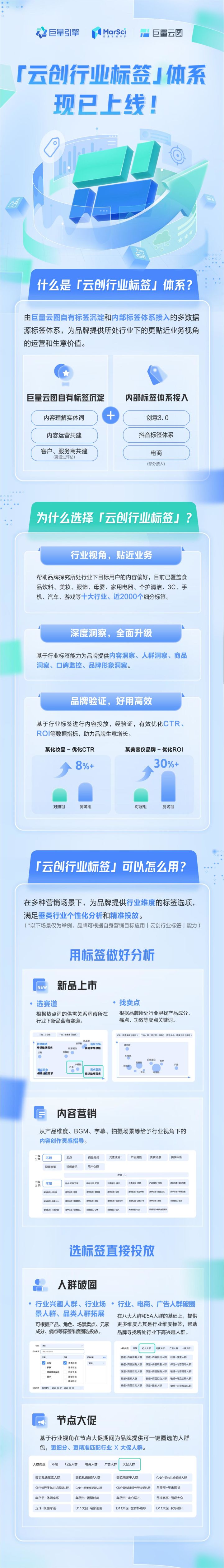 目前,「云創(chuàng)行業(yè)標(biāo)簽」已覆蓋食品飲料、美妝、服飾、母嬰、家用電器、個護(hù)清潔、3C、手機(jī)、汽車、游戲等十大行業(yè)、近2000個細(xì)分標(biāo)簽。這些標(biāo)簽與行業(yè)的具體業(yè)務(wù)場景緊密相關(guān),且包含內(nèi)容洞察、人群洞察、商品洞察、口碑監(jiān)控、品牌形象洞察等細(xì)分維度洞察。經(jīng)驗證,基于行業(yè)標(biāo)簽進(jìn)行內(nèi)容投放,可有效優(yōu)化CTR、ROI等數(shù)據(jù)指標(biāo),助力品牌生意增長。